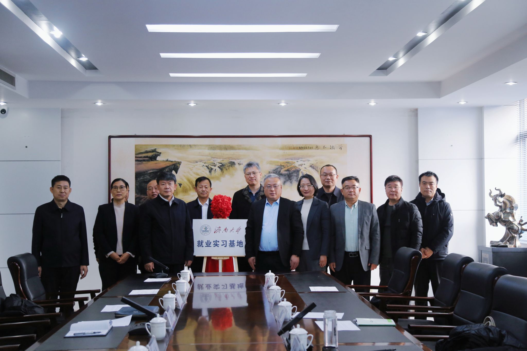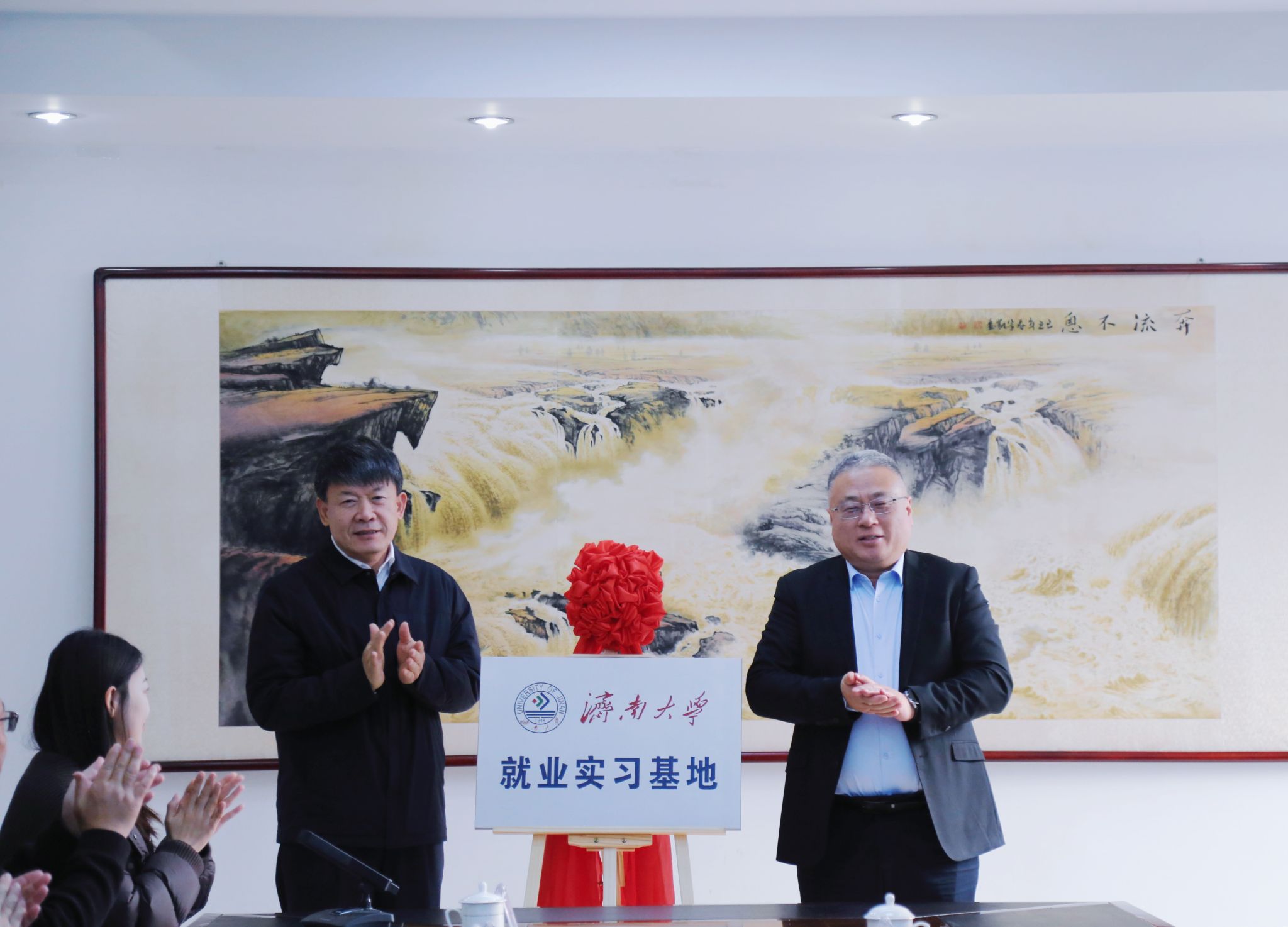 仪式现场,黄加栋与郑振亮共同为济南大学就业实习基地揭牌。合作发展处处长刘振与张滨共同签署济南大学与滨州经济技术开发区文化创意产业合作协议书。
