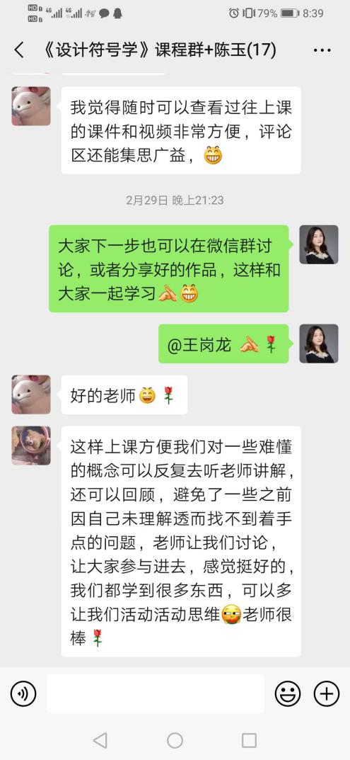 从互动截图中我们可以看到,学生们根据专业方向内容可以在不同的组里交流提问。另外,网上教学已经突破了上课时间的限制,学生们全天都可以进行专业交流。