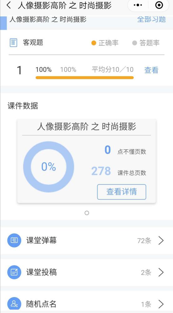 雨课堂强大的互动交流功能可以让我看到学生们的投稿作品,课前我会利用随机点名和弹幕(你最想看到哪位同学的人像作品)产生两名同学发布,并进行点评。深受同学们的喜爱。这样,不仅可以抽查大家的人像摄影知识是否巩固,还可以提醒督促大家要整理仪容有上课的仪式感(毕竟被点名之后再整理拍照就有点晚了)。
