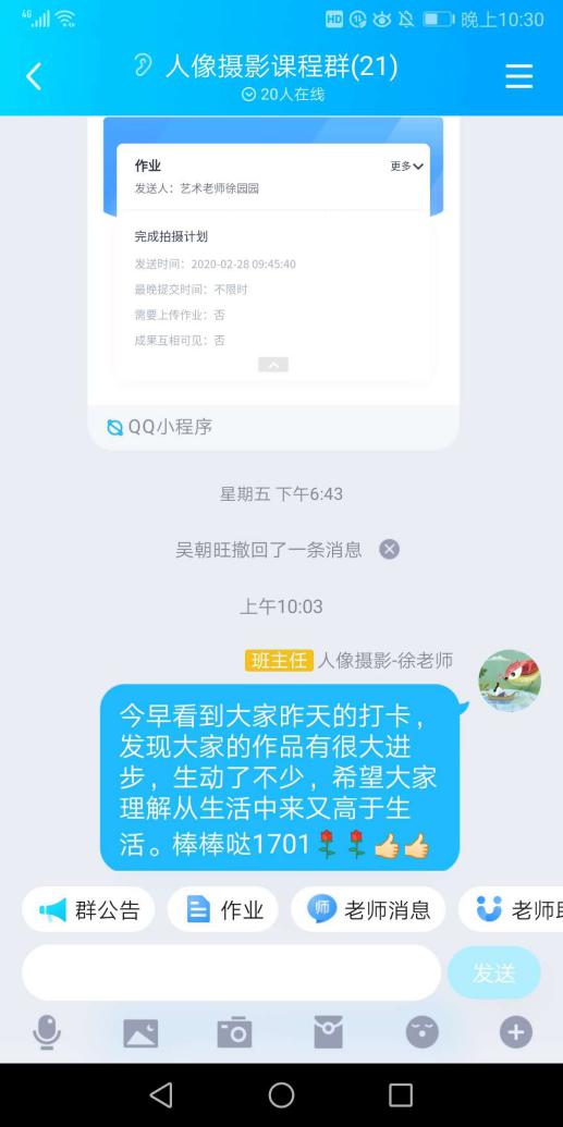 我的课马上进行到开课的第二周,并没有全部在线直播,而是根据课程需要安排了直播与在线学习、在线辅导相并行,我会在QQ课程群,随时管理学生的学习进度,和他们交流学习感受,一起解决遇到的问题。QQ群的“老师助手”可以发布作业也可以师生打卡。通过学生们每天提交的打卡作品我可以深深感受到学生们在一点一滴的进步,那种感觉就好像是看到自己种的庄稼在破土在发芽。