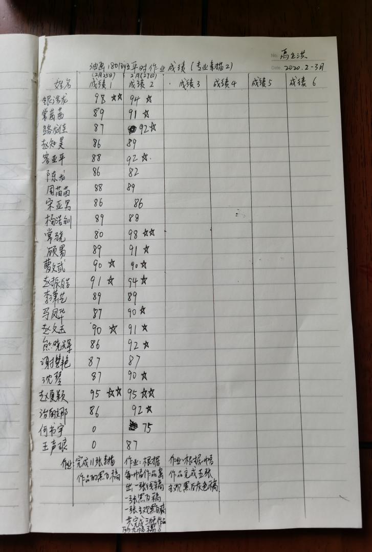 1.因为此课是技法课,学生的课堂练习是最关键的,用微信群语音和分享图片去讲解代表性作品,每天都安排课题作业,网络教学技法课不能现场督促学生认真完成作业,但是可以通过公布每天的成绩来激励学生,通过把学生的课堂作业打成具体分数,90分以上在名字后标注一颗星,95分以上标注两颗星,有效的调动了学生的积极性。