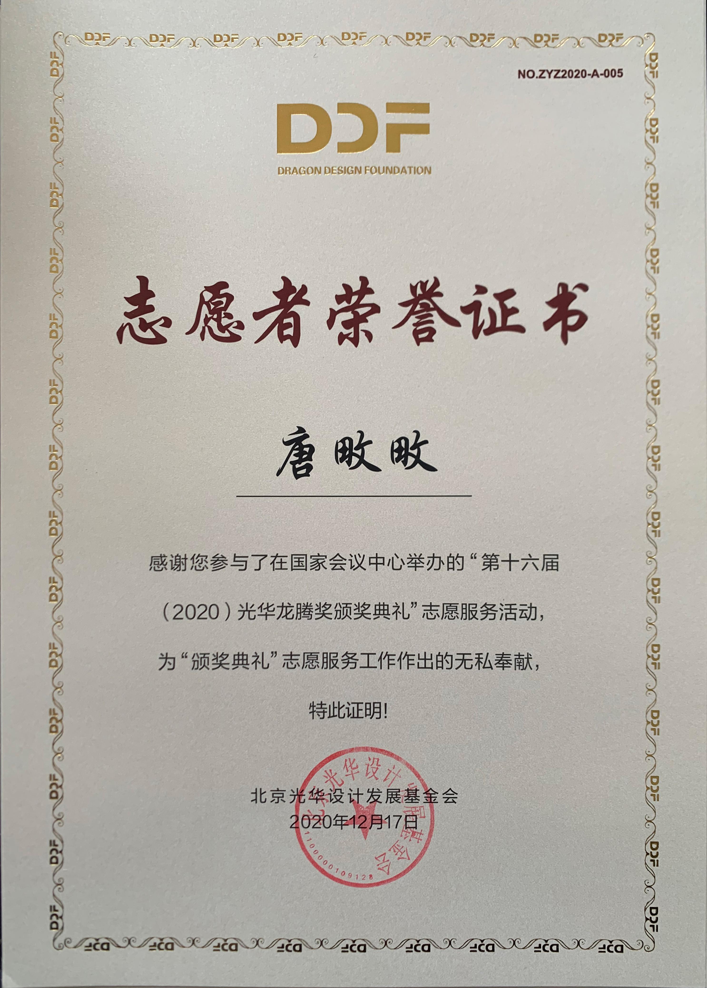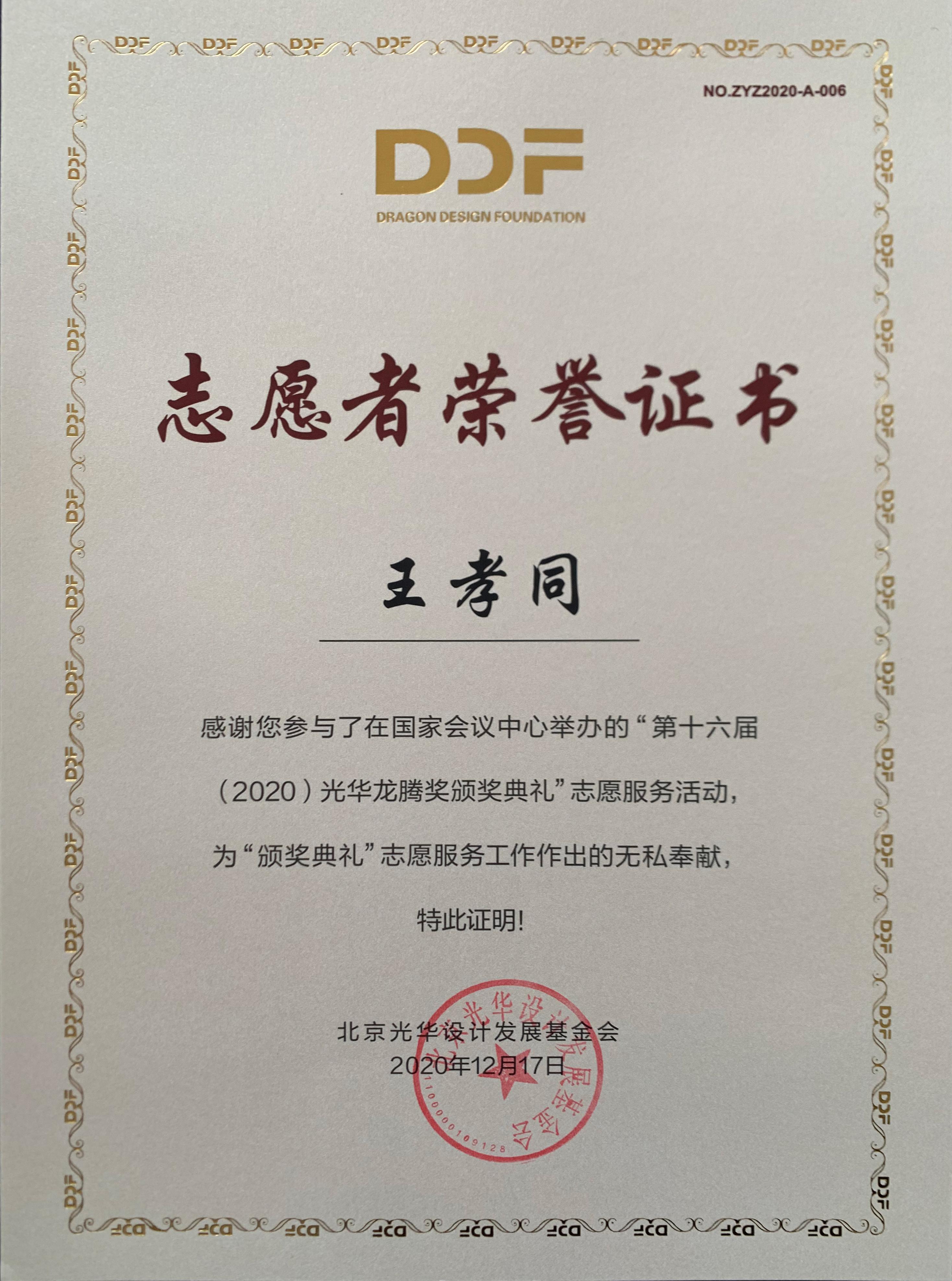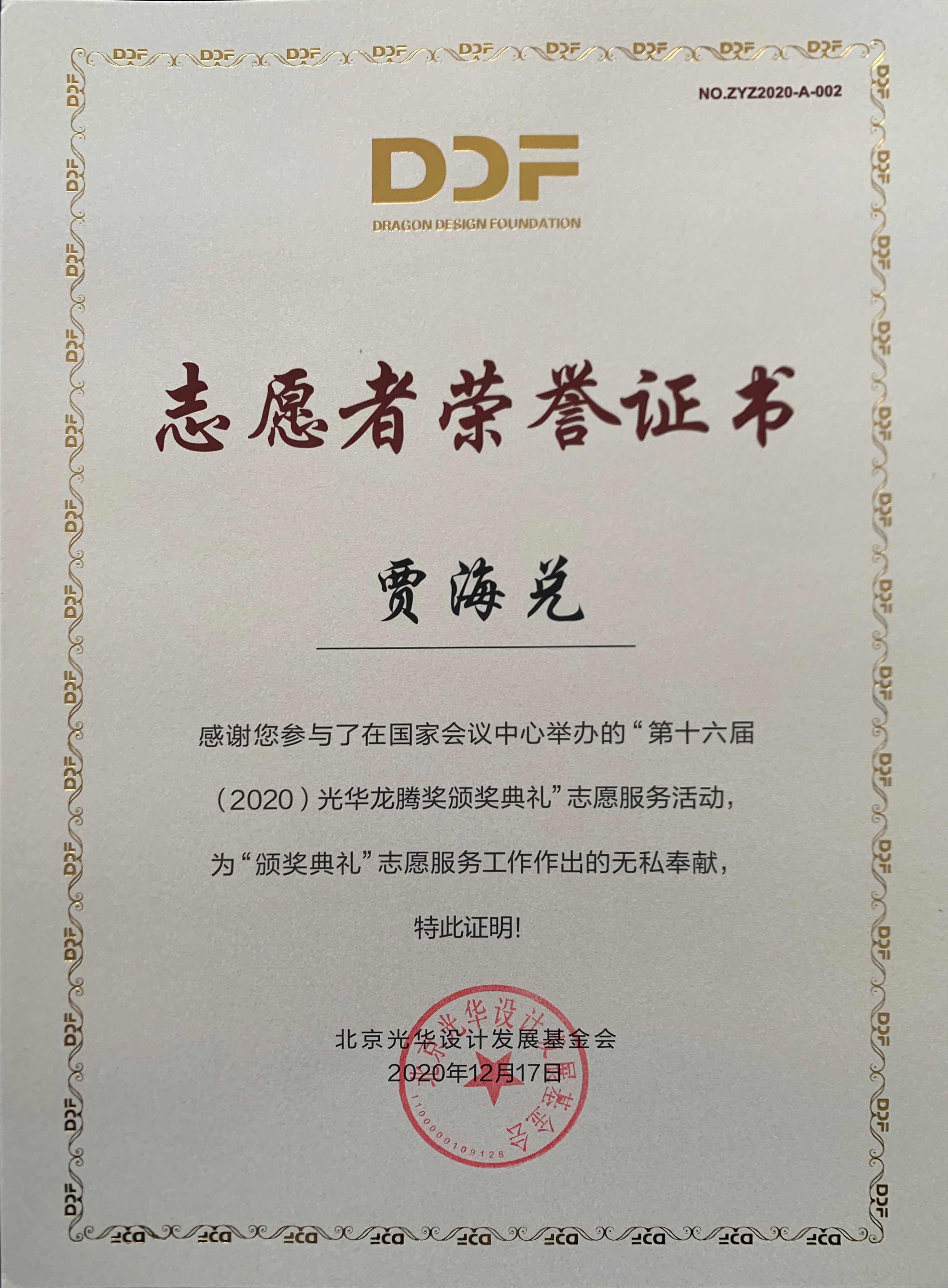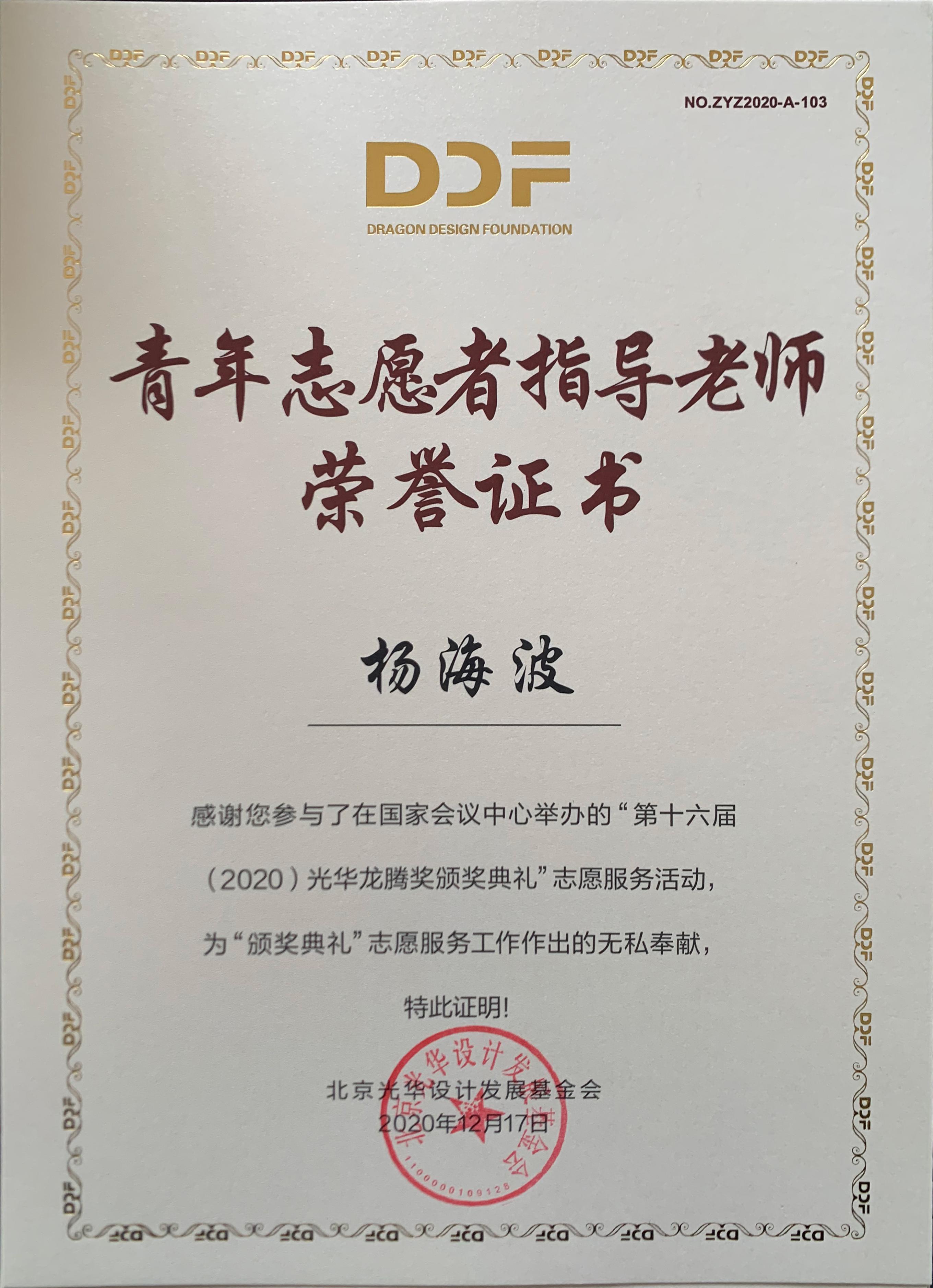 杨海波老师指导的“光华-济南大学志愿服务队”为北京光华设计发展基金会相关活动作了大量设计志愿服务工作,得到组委会高度肯定并获颁志愿者荣誉证书。