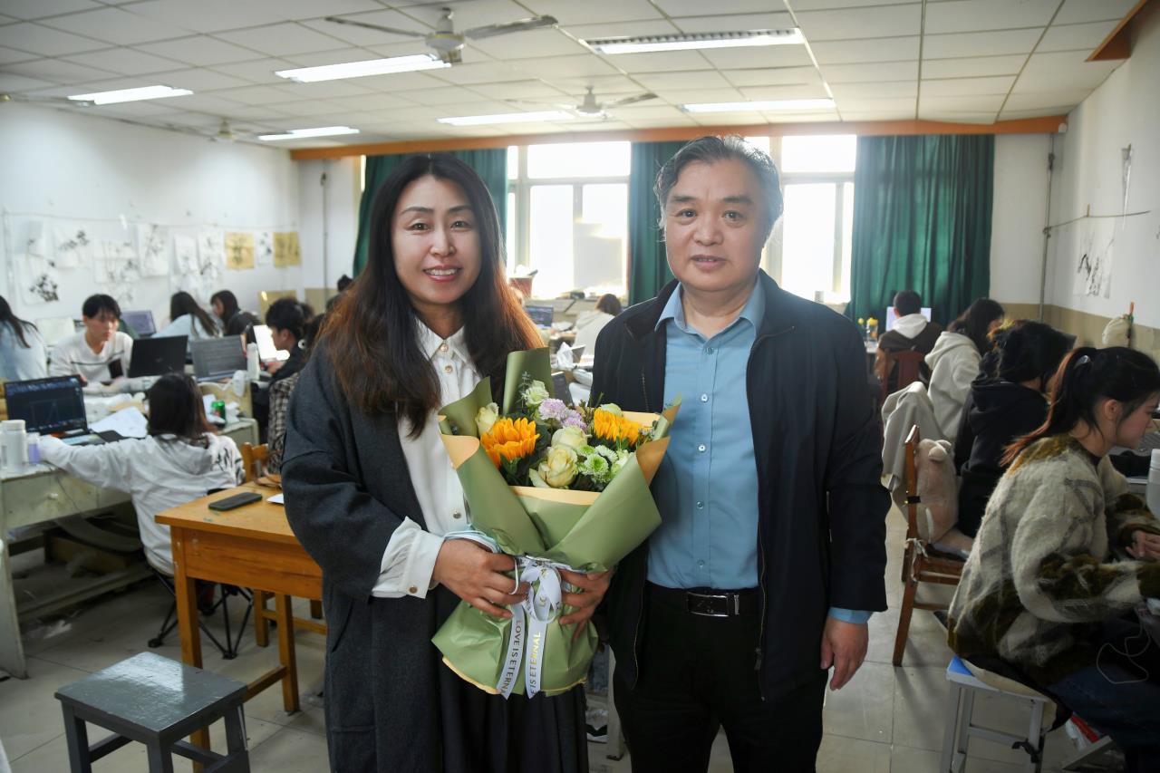 一束芬芳的鲜花,一句温馨的话语,表达着对女教师的尊敬,老师们收获的不仅仅是鲜花,更多的是惊喜、感动和幸福,当芬芳的鲜花和她们的笑脸融汇在一起,画室里洋溢的是一片温馨和甜蜜。在献花的同时,同学们也纷纷祝福老师们节日快乐,现场欢声笑语,领导们与教师分别合影留念,记录下了这份珍贵的时刻。