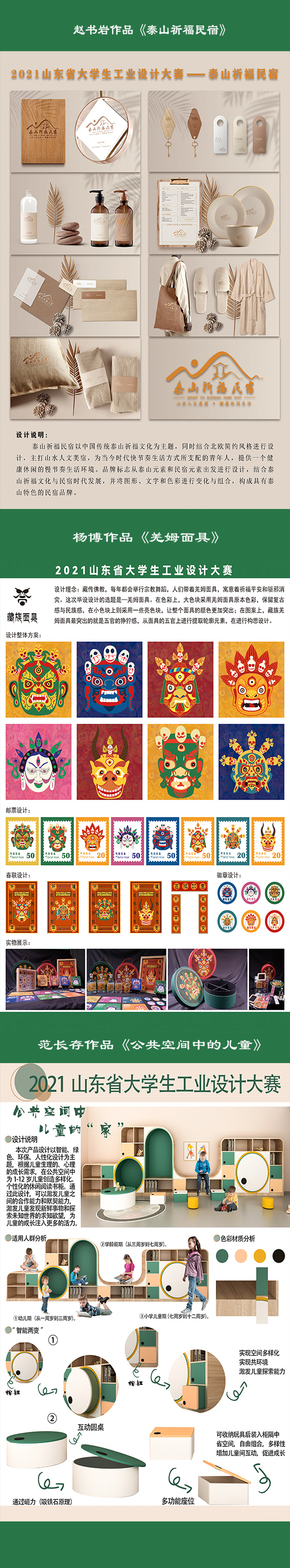 师生在本次比赛中硕果累累,成绩斐然。其中,2021级艺术设计专业研究生赵书岩同学作品《泰山祈福民宿》获一等奖;2021级艺术设计专业研究生杨博同学作品《羌姆面具》获一等奖;2021级设计学专业研究生范长存同学作品《公共空间中儿童的“家”》获三等奖;杨海波获优秀指导教师奖。