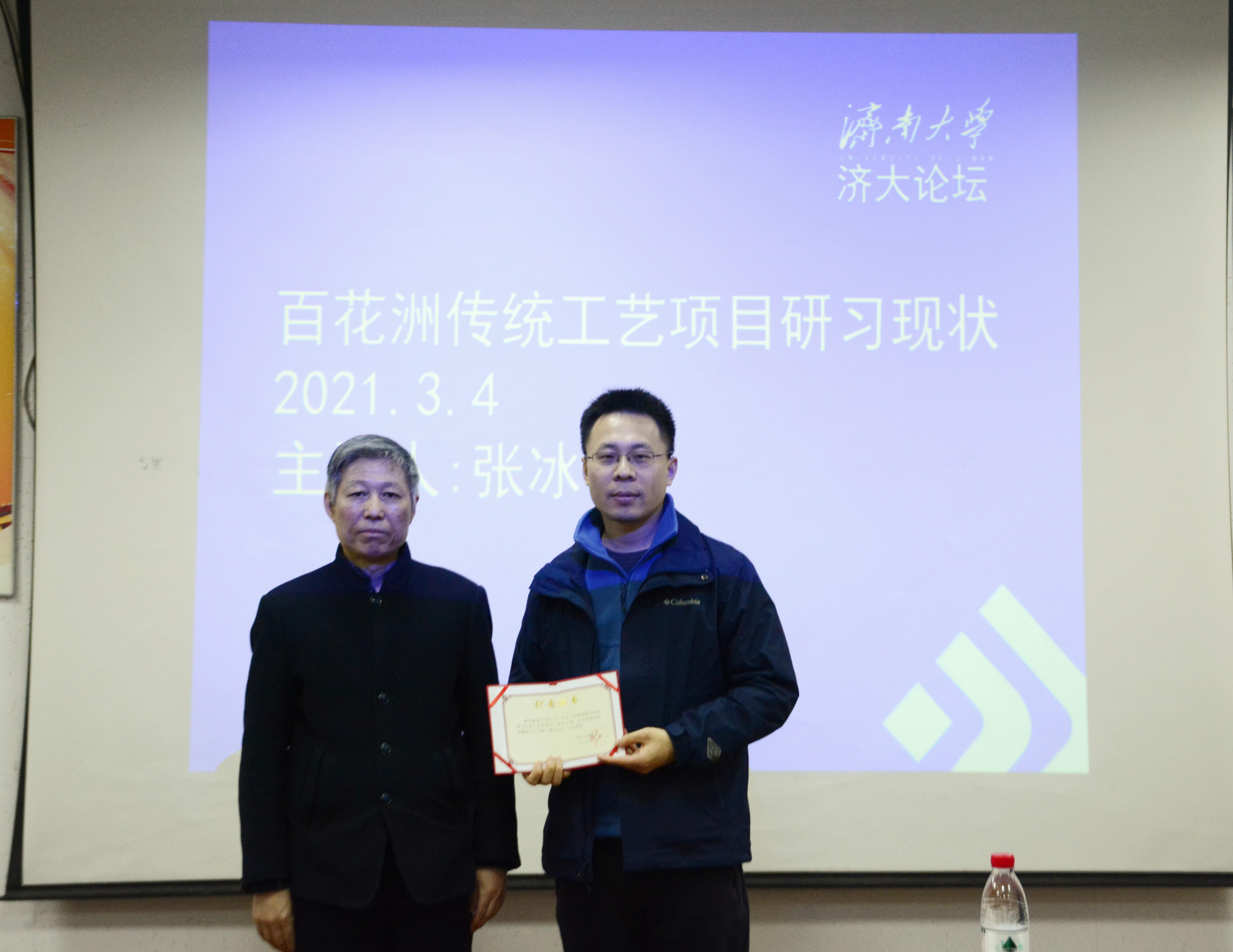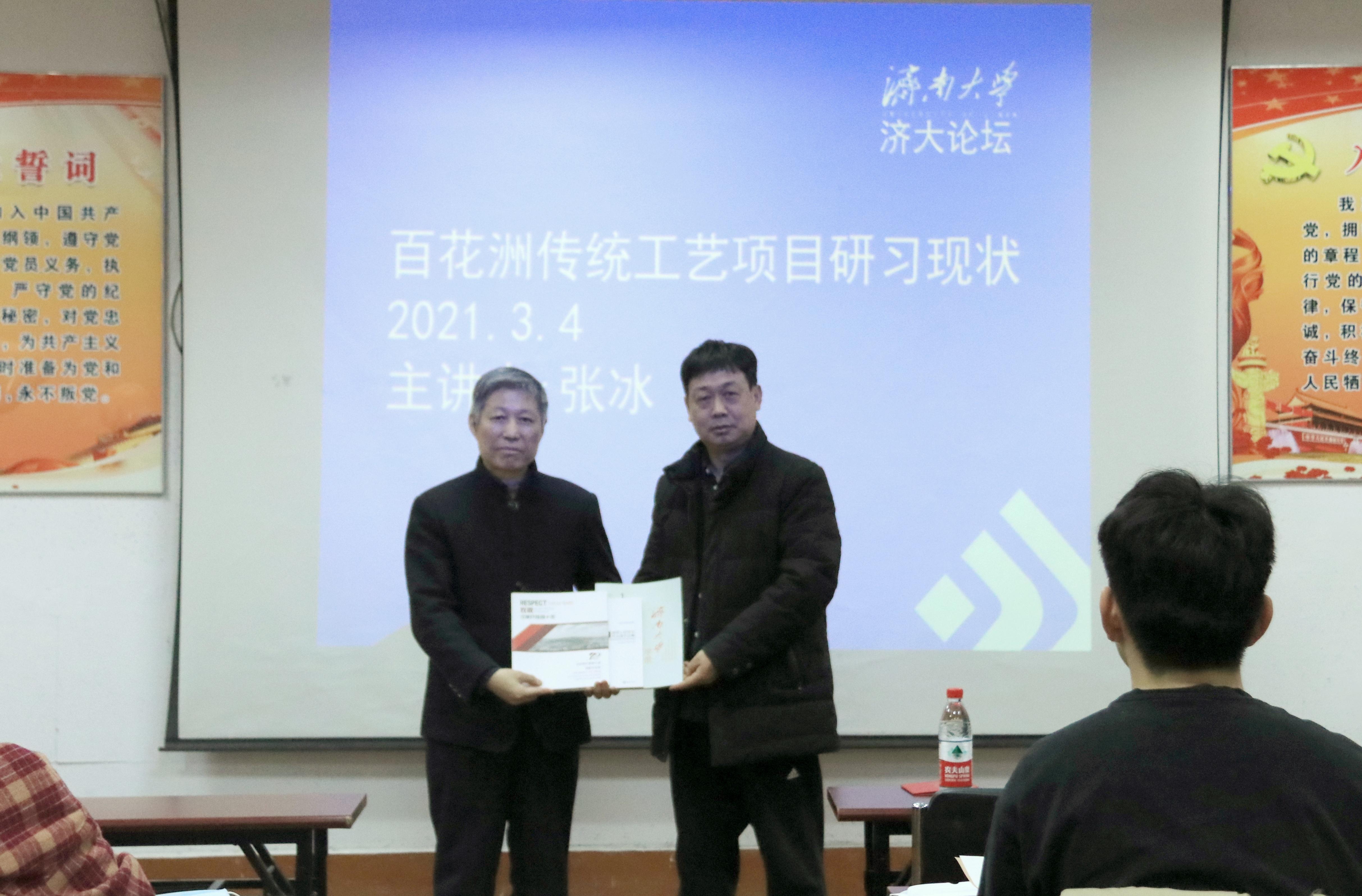 讲座开始前,张冰先生将自己的著作捐赠给学校图书馆,赵院长隆重介绍了张冰先生的手工艺生涯和成就、荣誉等,并为张冰先生颁发图书捐赠纪念证书。刘东涛老师向张冰先生赠送济南大学学报、电竞牛 研究生作品集。在同学们热烈的欢迎后,张冰先生向同学们介绍了“济南百花洲传统工艺工作站”的非遗、手工艺项目保护发展现状。