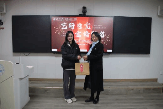 在温馨而亲切的氛围中,学院领导为同学们逐一送上精心准备的“考研加油包”,内含“橘”重若轻、“糕”枕无忧、“棒”上有名、“苹”安上岸、一战“橙”硕、一“旺”到底等美好寓意的各项礼品,还附有一张张由学弟学妹精心设计的手写明信片,一字一句写满对学长学姐的敬意与祝福,收到“考研加油包”的学子备受鼓舞,纷纷表示将全力以赴,以实际行动回馈每一份沉甸甸的关心与鼓励。