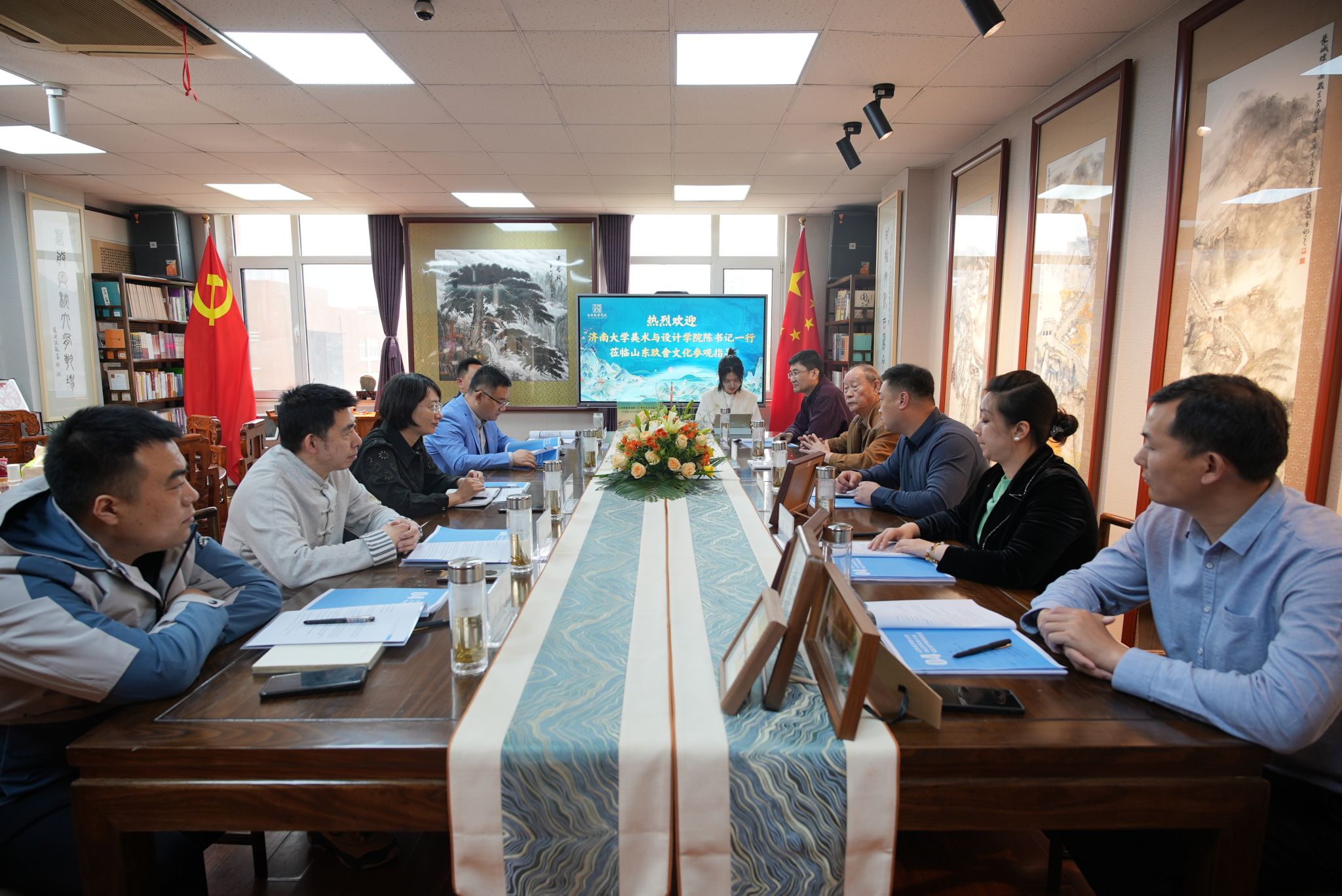 为深入学习贯彻党的二十大精神,坚决实施就业优先战略,深入拓展就业资源,4月11日,电竞牛 党委书记陈春锋,党委副书记、副院长何贵亮,美术系主任陈炜,学生工作办公室主任王鹏飞,实训中心主任成海明一行5人到山东玖舍文化艺术传媒有限公司进行走访调研,拓展就业渠道,助力毕业生高质量就业。中国孔子书画院周艺,山东玖舍文化艺术传媒有限公司总经理贾南,副总经理陈虹、王帅俊等人进行了热情的接待。